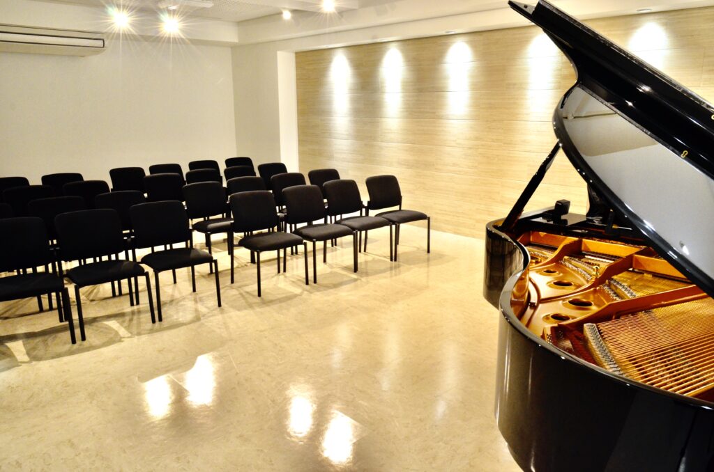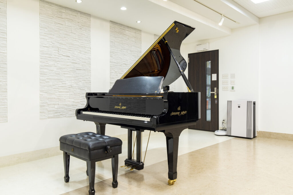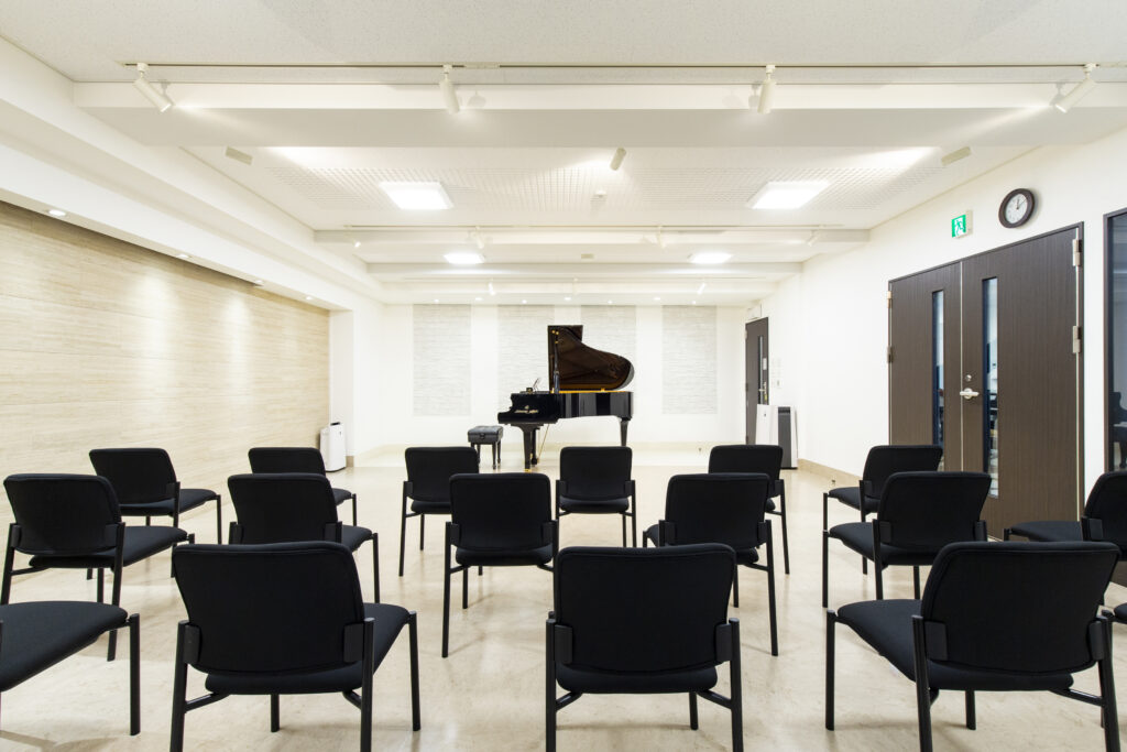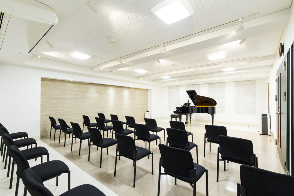 50名収容、グランドピアノ(シゲルカワイSK2)、防音控室も完備。